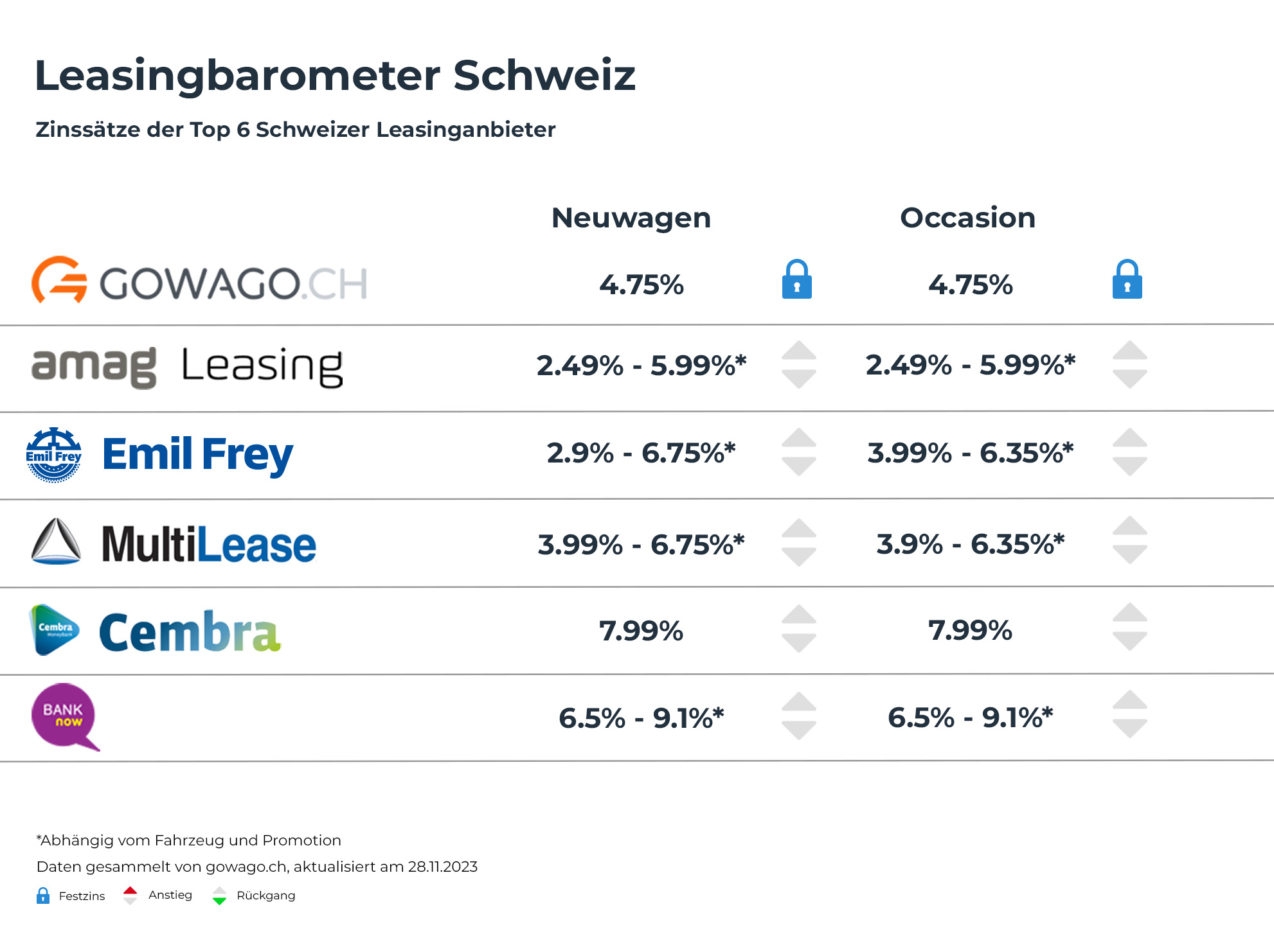 Willkommen beim Leasingbarometer der Schweiz! Wenn man sich dazu entschlossen hat, ein Auto durch ein Leasing zu finanzieren, öffnet sich die nächste Qual der Wahl: mit welcher Gesellschaft und zu welchem Zins?